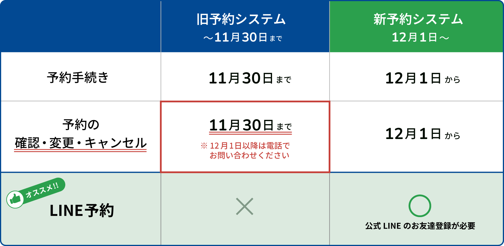 現行のWeb予約システムは、2025年11月30日(日)まで「ご予約」「確認」・「変更」・「キャンセル」が可能です。